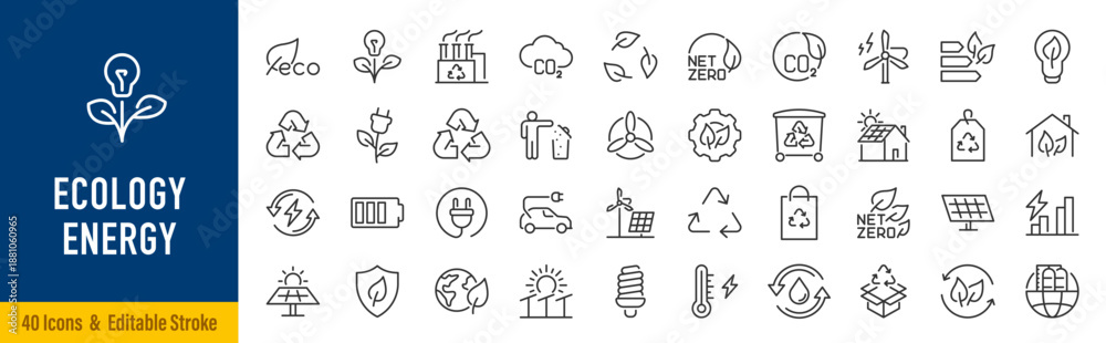Ecology and Energy web icons in line style. Nature green, electric car, organic, renewable energy, green technology, environmental energy collection. Editable stroke. Vector illustration. #1881060965