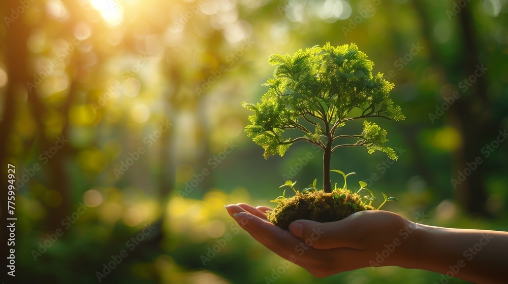 Ecology banner concept. Human hands are holding a small tree. Horizontal green photo ecology concept. #775994927