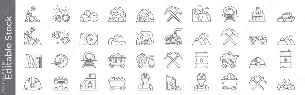Editable diamond, gold and coal mining line icon set – miner, mines, coal, excavation, gemstone, gold bar, pickaxe, cart, tunnel, industry outline symbols #1785978190