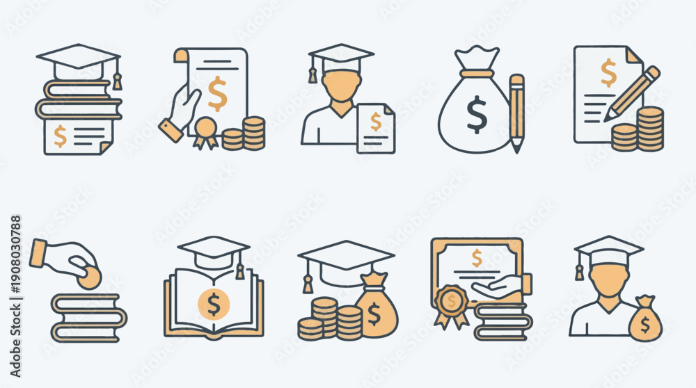 Education and financial aid line icons set: scholarship, student loan, tuition #1908030788