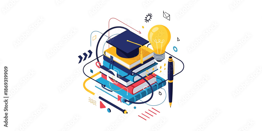 Education Concept Graduation Cap on Stack of Books with Light Bulb and Pen #1869319909
