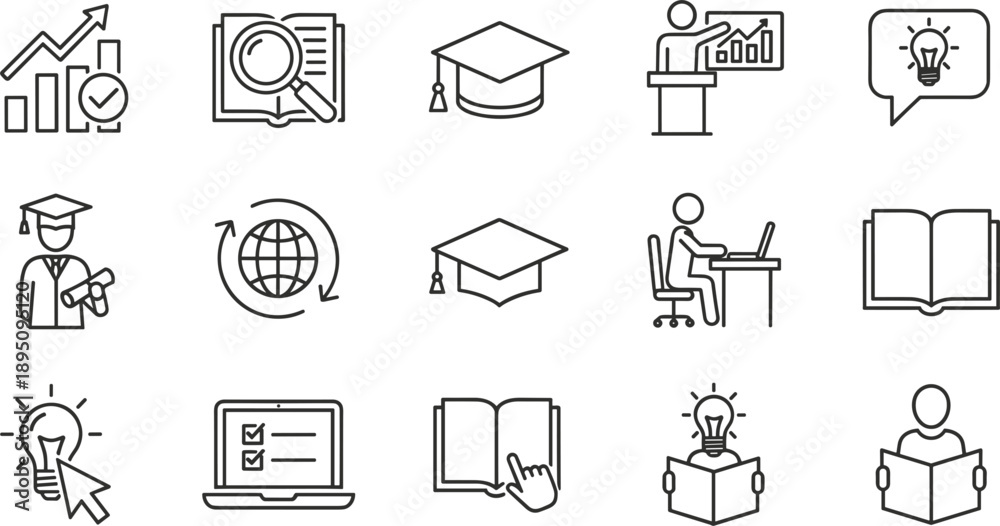 Education learning and business training line icon set with analytics teaching online study and idea symbols #1895095120