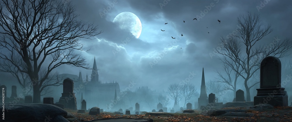 Eerie graveyard scene under a full moon, shrouded in mist. Gothic architecture looms in distance #1406287274