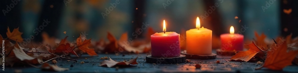Eerie Halloween Candles Cast Shadows on Cobwebs and Autumn Leaves Spooky Ambiance for Decorations and Autumnal Themes #1761871146