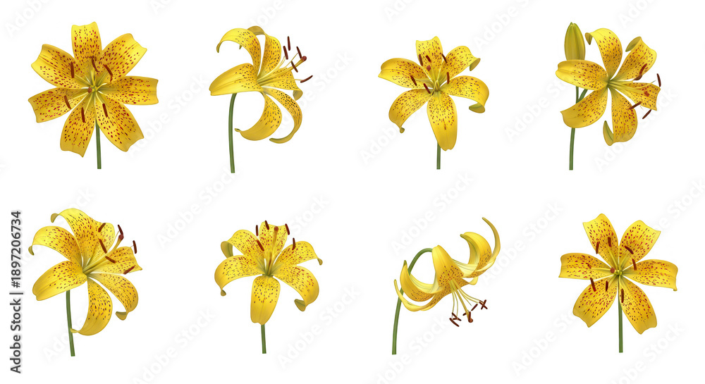 eight vibrant yellow tiger lilies displayed against a white backdrop botanical illustrations use as floral graphics #1897206734