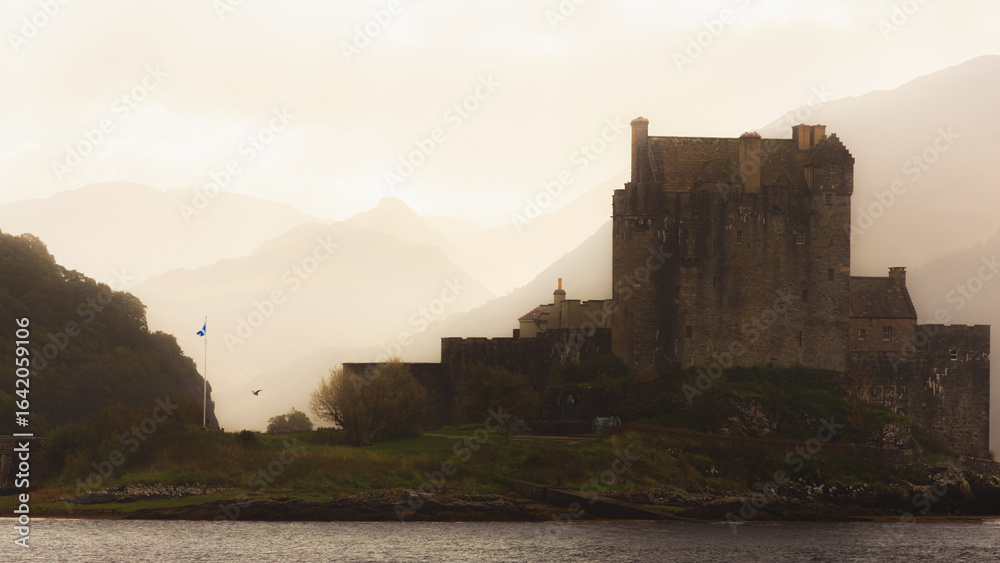 Eilean Donan Castle on Loch Duich near Dornie in the Scottish Highlands shrouded in mist and moody atmospheric light. #1642059106