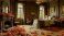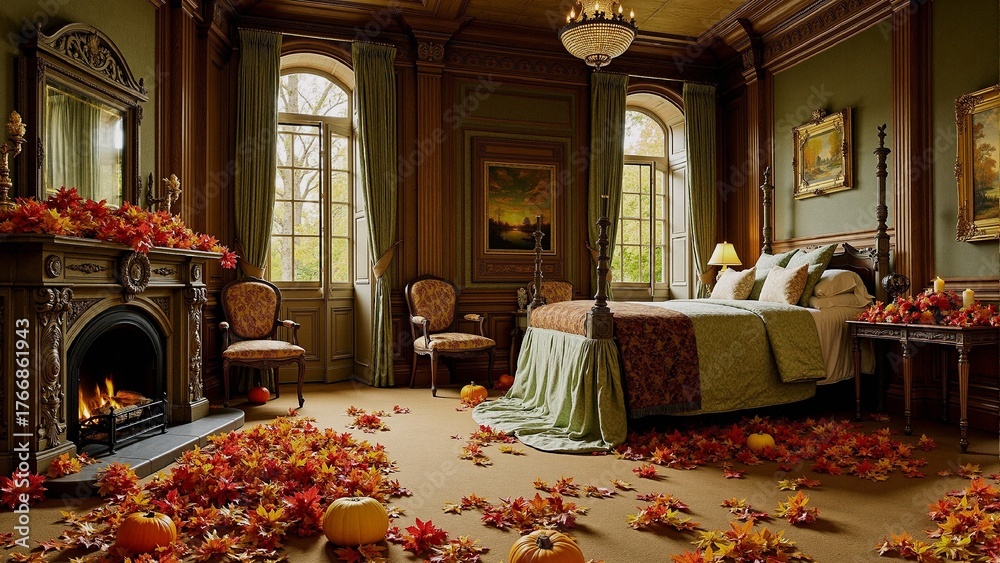 Ein großer Raum mit Bett und Kamin ist voll von buntem Herbstlaub und Kürbissen #1766861943