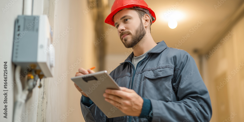 Ein Mann in Arbeitskleidung steht im Keller. Er notiert sich auf einem Clipboard Werte. Gas oder Elektrik #1646725494