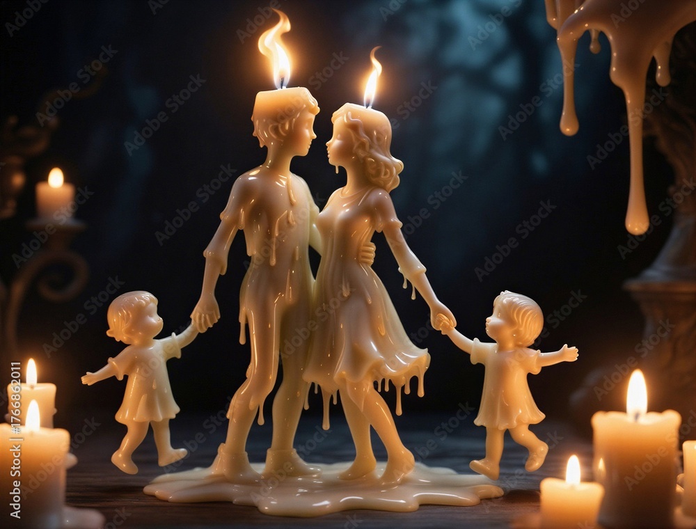 Eine Familie mit Kindern aus Wachs, an den Eltern brennt oben eine Kerze #1766862011