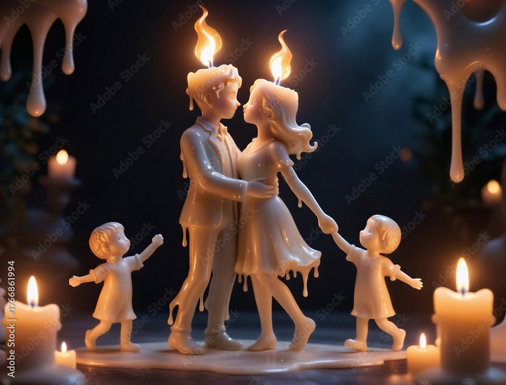 Eine Familie mit zwei Kindern geformt aus Wachs, die beiden Eltern brennen am Kopf als Kerze #1766861994