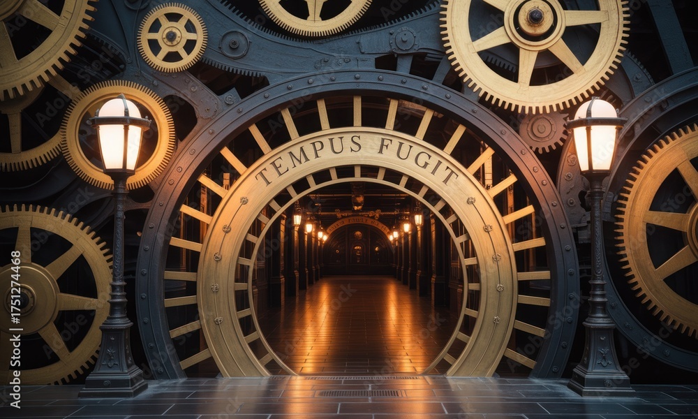 Elaborate clockwork entrance with "Tempus Fugit" archway, leading to a warmly lit passage #1751274468