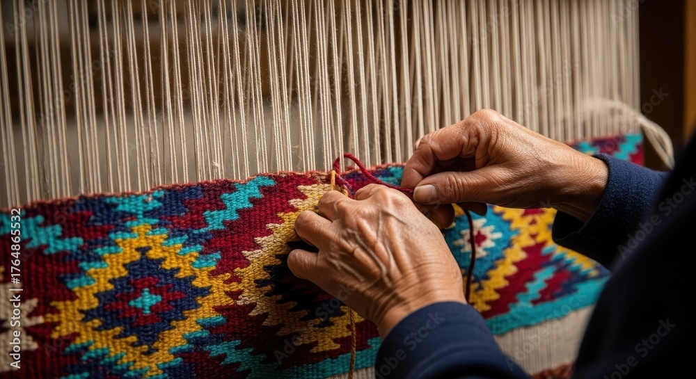 elder woman's hands weaving colorful geometric pattern on traditional loom. warm light on textured wool. heritage, artisan skill, and cultural craft. #1764865532