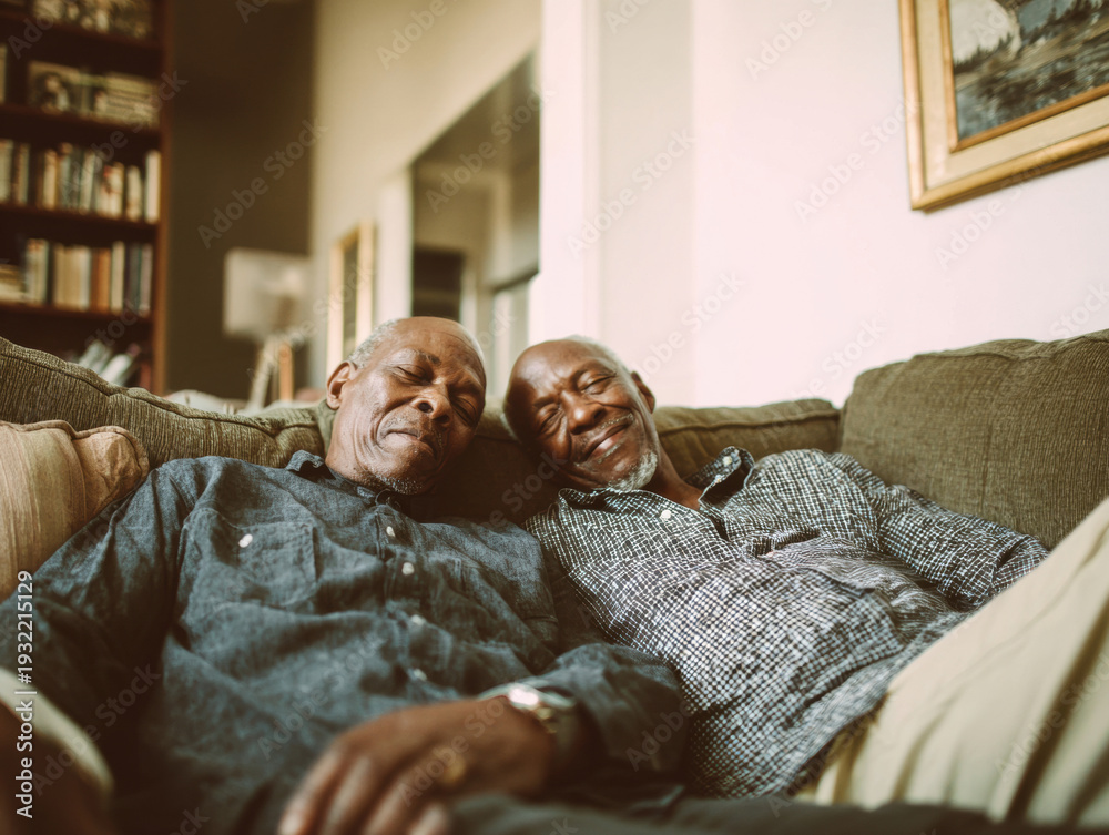 Elderly Black gay couple relaxing on sofa smiling and resting in cozy living room #1932215129