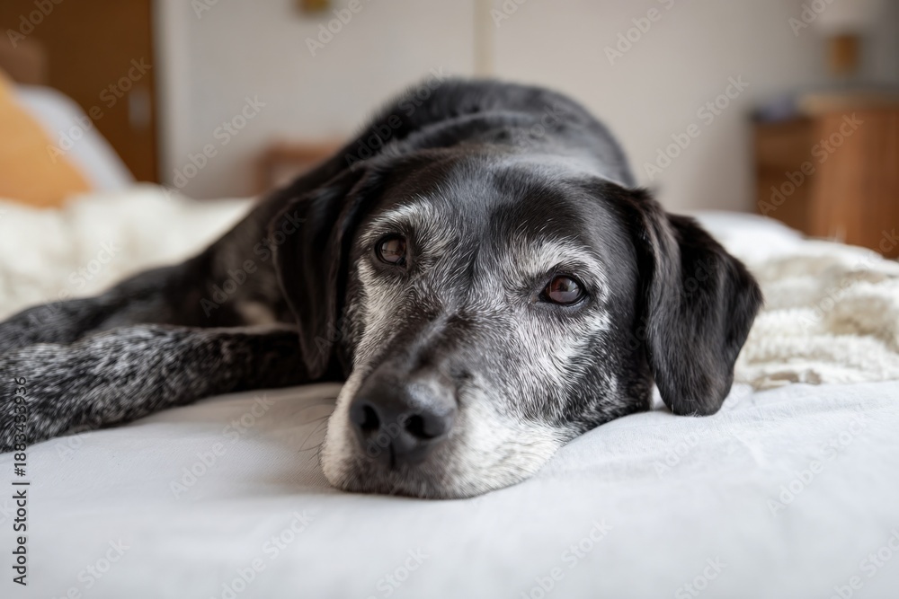 Elderly dog resting calmly on bed with soft blanket #1883433936