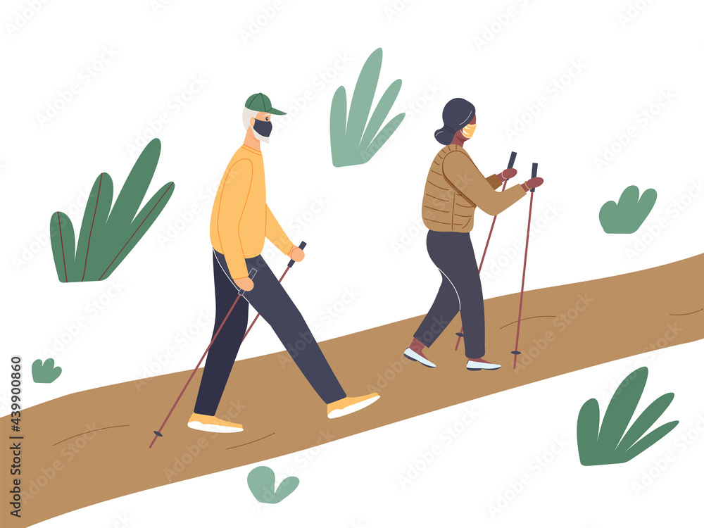 Elderly fit man and african woman engaged in Nordic walking with sticks on path in park. Old athletic male and plump fashionable black female walk on foot in the open air.Healthy lifestyle.Raster #439900860