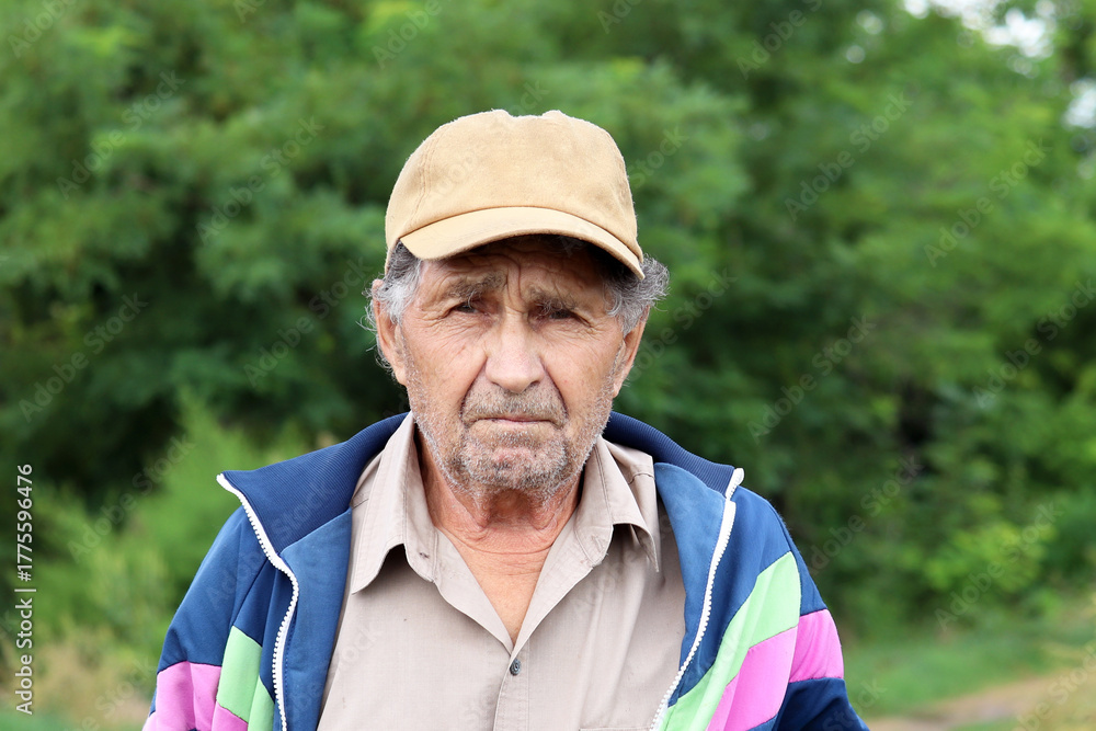 Elderly man looks into camera on forest background. Sad face expression, concept of life in village, old age and retirement #1775596476