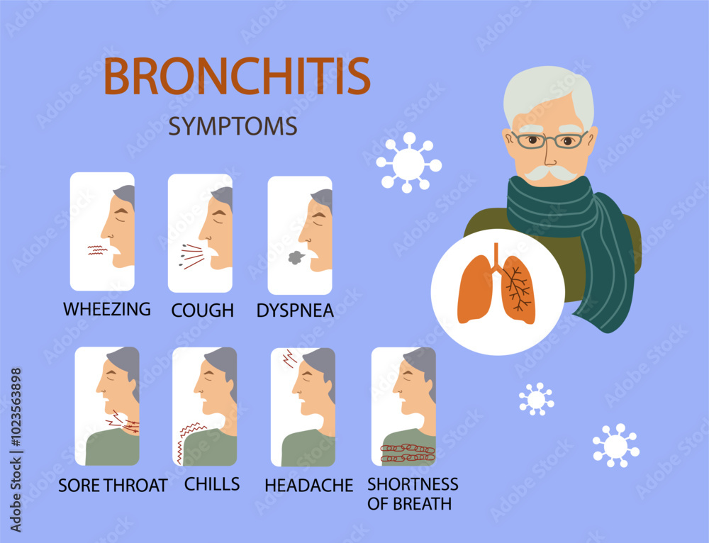 Elderly people bronchitis symptoms Infographic poster with text and cartoon character. Senior people health care Concept. Vector flat illustration #1023563898