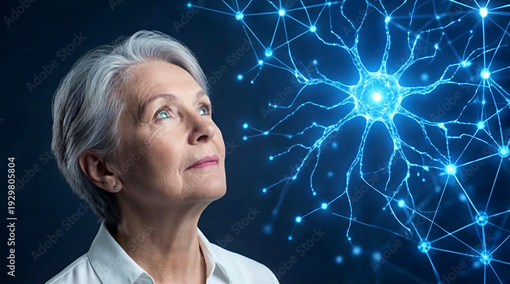 Elderly woman looking at glowing neural network visualization. Cognitive health and brain function concept for senior citizens. #1929805804