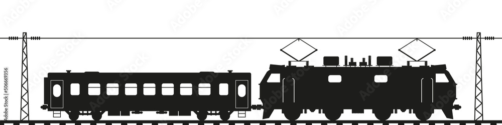 Electric locomotive with passenger car. Train silhouette. Flat vector illustration isolated on white background. #506669356