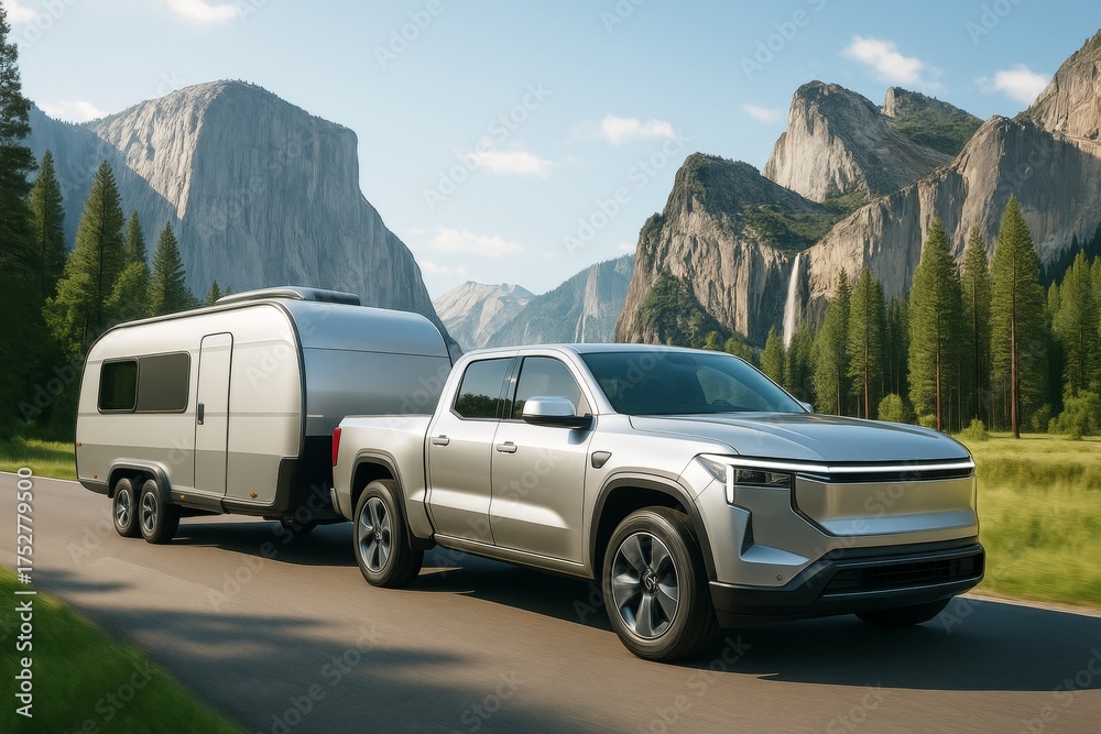 Electric pickup truck towing modern travel trailer on scenic mountain highway surrounded by pine trees and cliffs under clear blue sky light.. Ai generative #1752779500