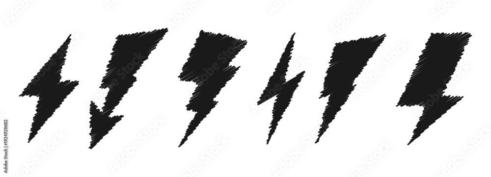 Electric thunderbolt icons drawn with brush strokes and rough texture. Six lightning symbols in black sketch style. Hand-crafted grunge elements for creative projects. #1924928682