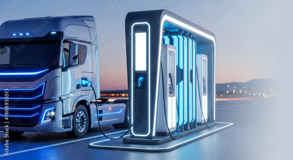Electric truck charging at a modern charging station. Future transportation concept with sustainable energy solution for trucking industry. #1806933513
