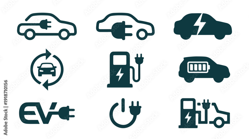 Electric vehicle and charging station vector icon set #1918710156