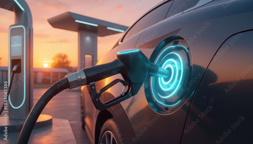 Electric vehicle charging cable connected to a car at a modern charging station during a beautiful golden hour sunset #1944045386