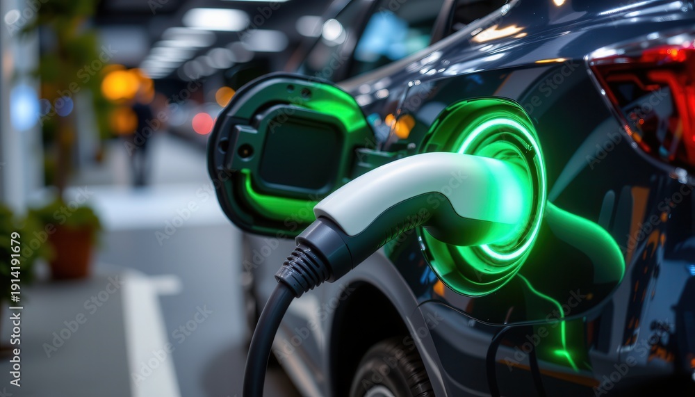 Electric vehicle charging station with glowing port in modern urban environment at night #1914191679