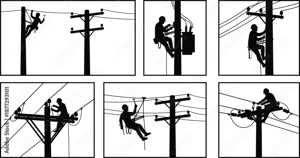 Electrician lineman silhouettes, power line maintenance, utility pole workers, electrical safety, energy infrastructure, repair, industry, vector illustration set, collection, icons #1877293101