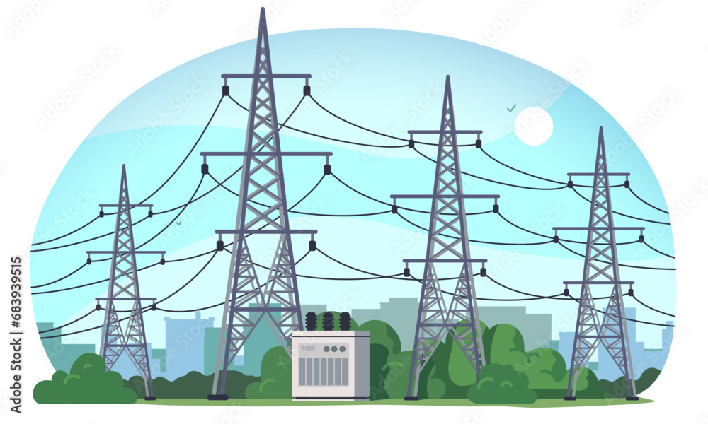 Electricity power transmission line towers. Industrial electrical energy supply pylons row with transformer, high electric voltage cables, sky, cityscape in background. Flat vector illustration #683939515