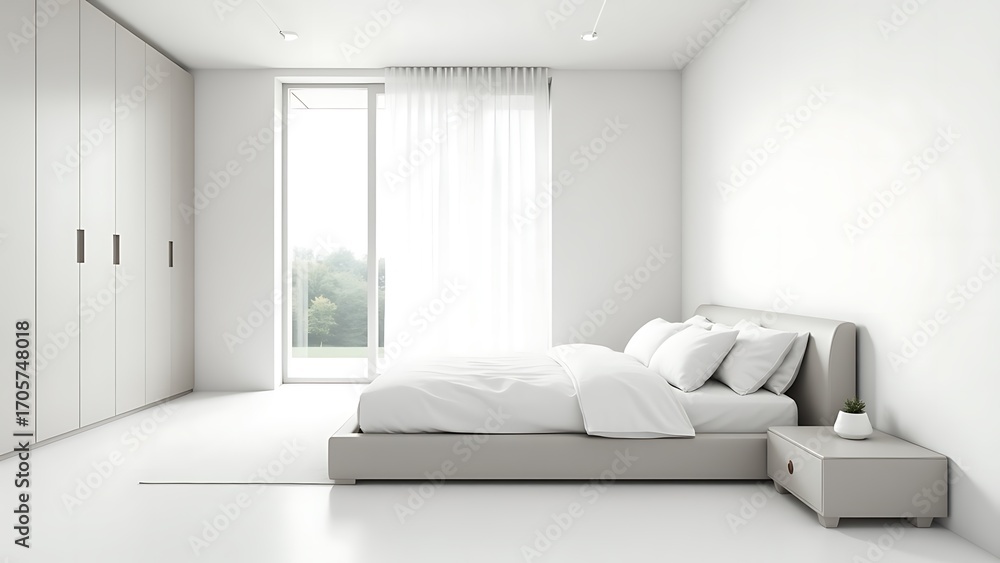 Elegant and bright contemporary bedroom with minimalist decor, a comfortable bed, clean white surfaces, and a large window providing ample natural light and a serene view #1705748018