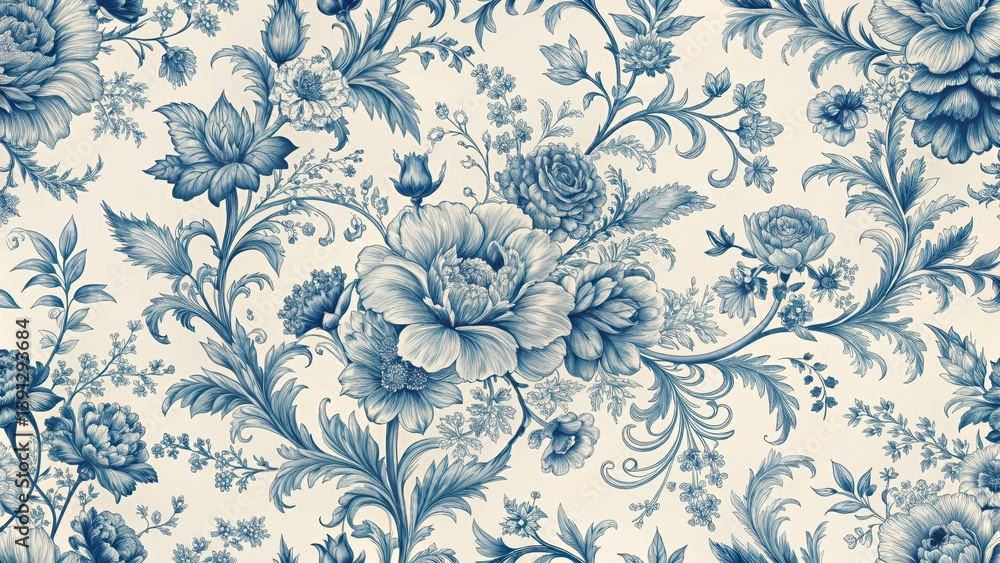 Elegant and sophisticated vintage French floral toile blue pattern with intricate floral motifs and delicate scrollwork, floral #1391293684