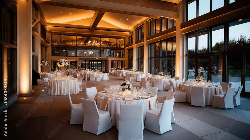 Elegant banquet hall with large windows, decorated tables with white tablecloths, candles, and floral centerpieces, warm ambient lighting, and stylish modern chairs. #1084053518