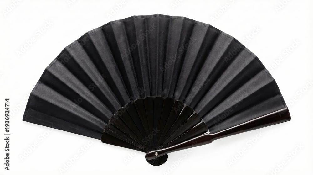 Elegant black handheld folding fan with geometric pleats and wooden handle on white background #1936924714