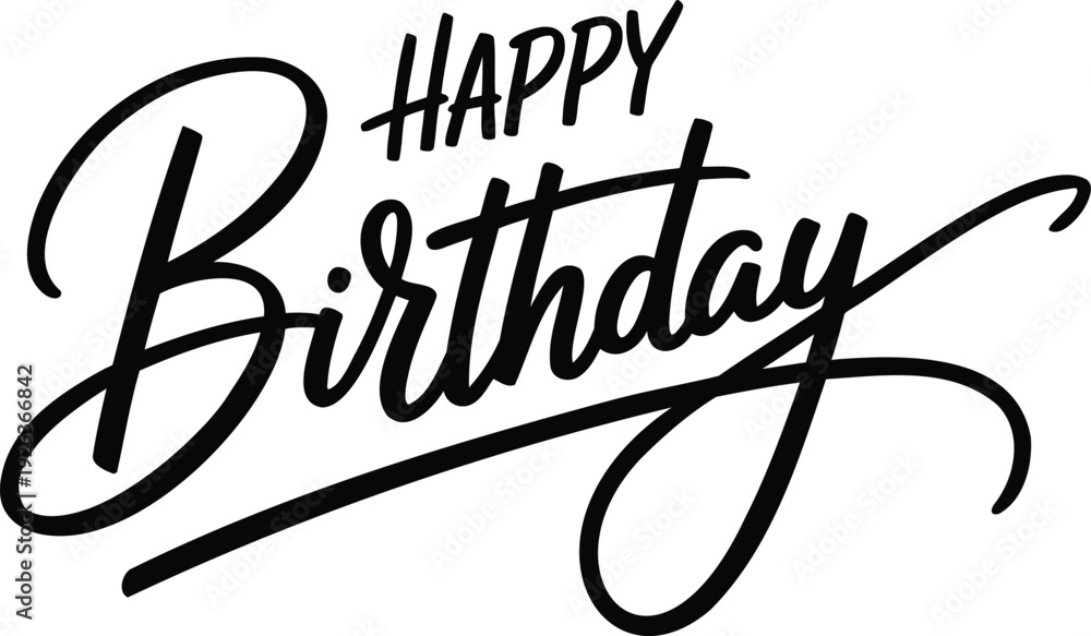 Elegant black happy birthday script calligraphy with dynamic brush strokes on white background #1926366842