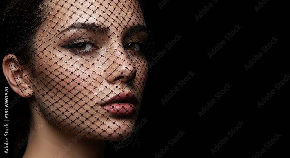 Elegant black netting covering the face, detailed formalwear accessory for a sophisticated gala or exclusive evening event, classic fashion style ,detail ,apparel ,evening #1906961670