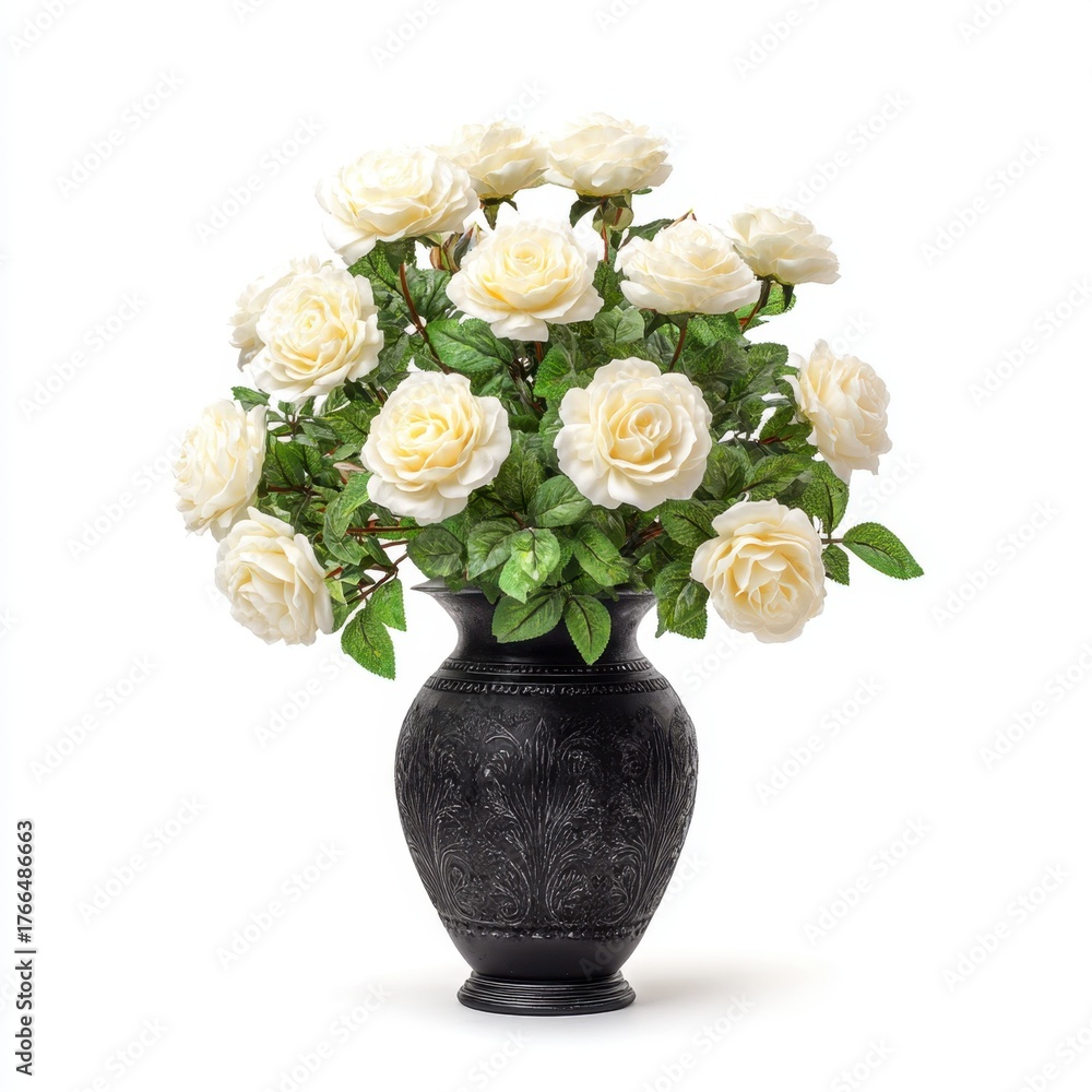 Elegant black vase with a bouquet of white roses and green leaves arranged beautifully for home decoration and floral design inspiration #1766486663