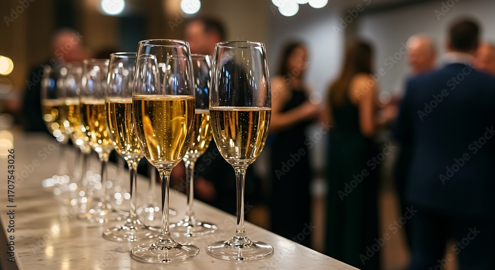 Elegant champagne flutes filled with a light-colored sparkling wine on a bar counter, with a blurred backdrop of a fashionably dressed crowd at a gala. #1707543026