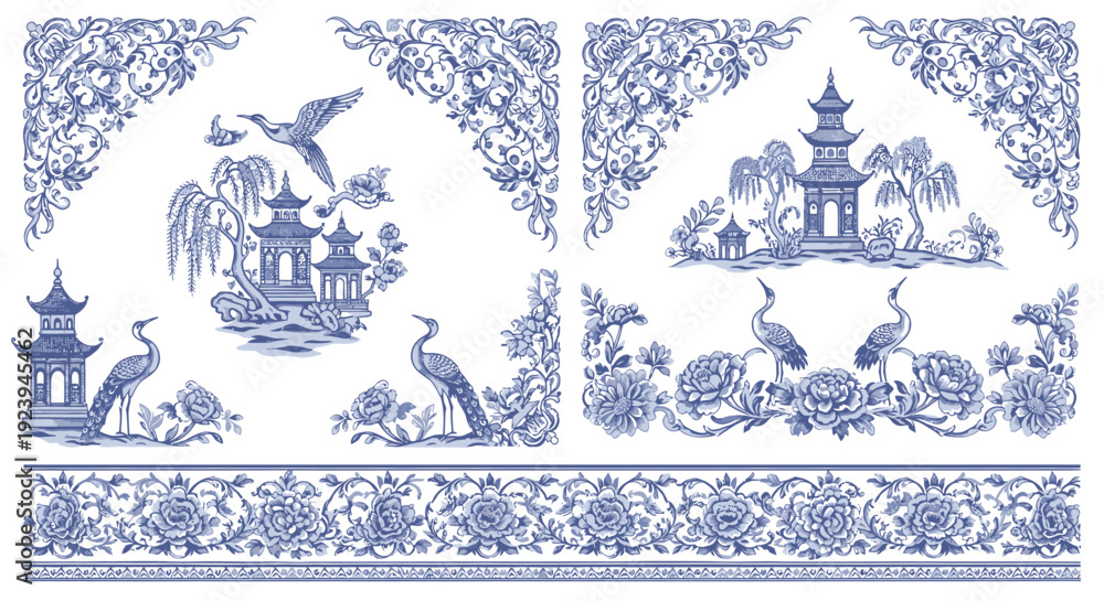 Elegant Chinoiserie Borders and Blue Porcelain Vector Frames #1923945462