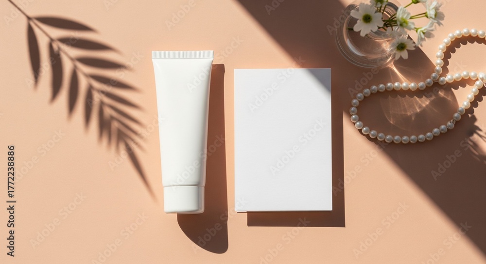 Elegant cosmetic tube, blank card, and pearls on peach background with shadows #1772238886