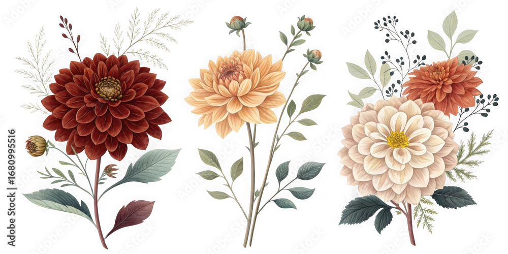 Elegant floral arrangement features red yellow and white dahlia blooms with lush greenery transparent background #1680995516