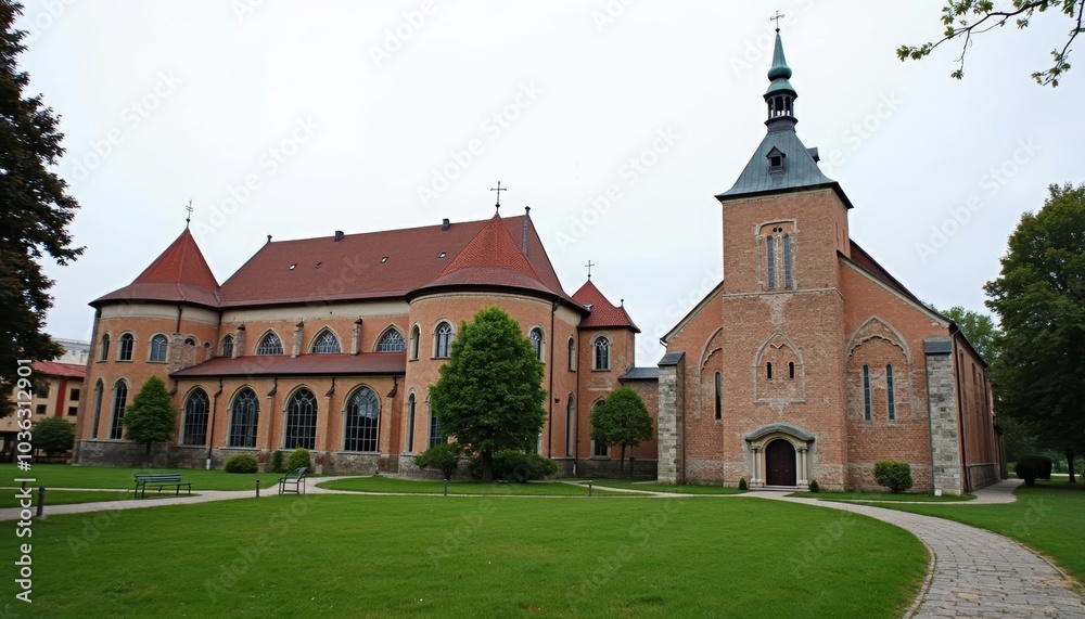 Elegant Gothic Revival church with lush green lawn #1036312901