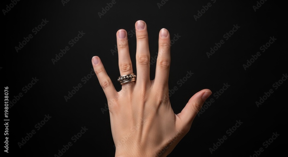 Elegant hand showcasing stylish rings against a black background #1980138076