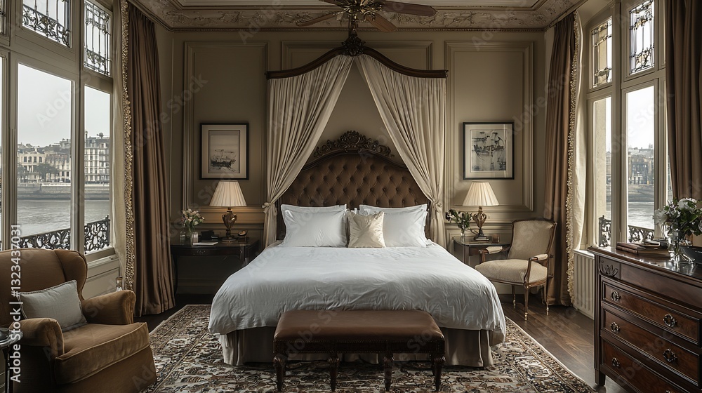 Elegant hotel bedroom featuring a large bed, classic decor, and a scenic river view #1323437031