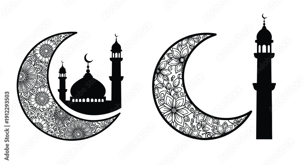 Elegant Islamic crescent moon designs with mosque and floral patterns vector art #1912293503