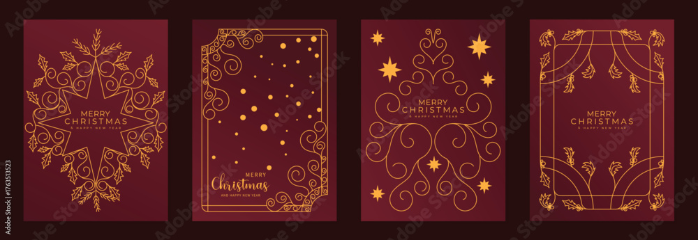 Elegant Merry Christmas and Happy New Year greeting card vector set with gold line art decorations, green background, holiday frames for celebration #1763513523