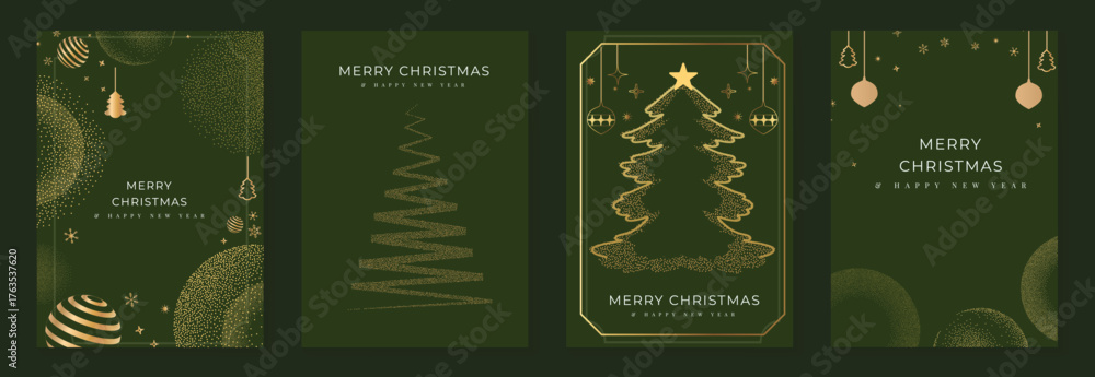 Elegant Merry Christmas and Happy New Year greeting card vector set with gold line art decorations, green background, holiday frames for celebration #1763537620