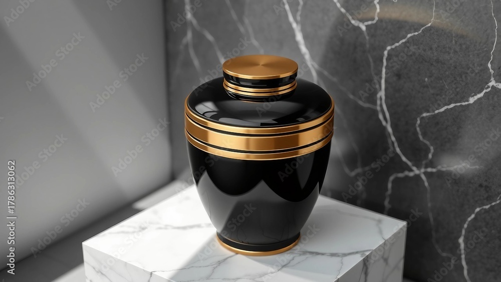 Elegant modern black cremation urn with gold details, luxury memorial design on marble surface with soft shadows. #1786313062