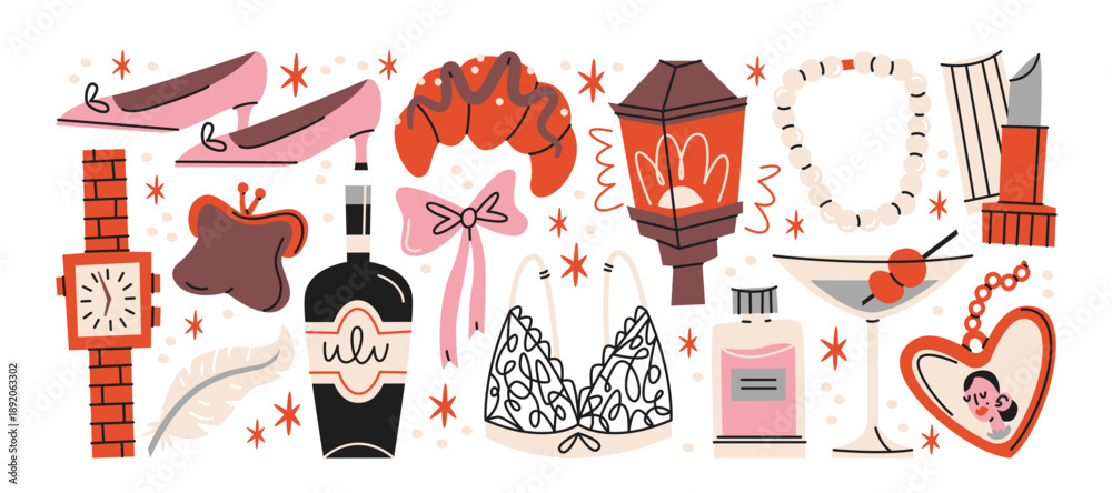 Elegant 90s fashion stickers in retro cartoon style. Luxury items: high heels, wristwatch, perfume bottle, lipstick, lingerie, jewelry, cocktail glass. Chic feminine lifestyle concept #1892063302